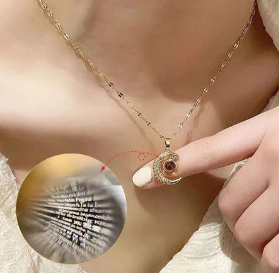 Este collar es más que una joya; es una expresión de amor universal. Con un simple proyector de luz, podrás ver el mensaje "Te amo" en 100 idiomas diferentes, creando un momento mágico e inolvidable. Es perfecto para recordarle a esa persona especial cuánto la amas, sin importar la barrera del idioma.