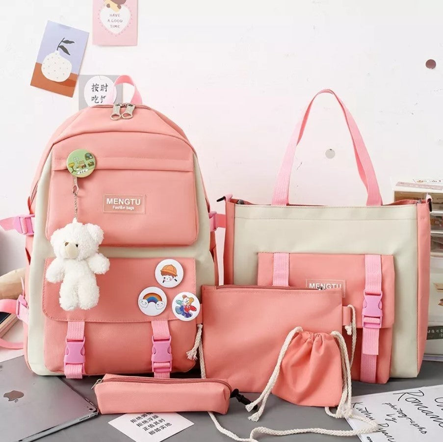 El set incluye una mochila, una bandolera, una bolsa de mano, una bolsa de papelería y un monedero, todos diseñados para satisfacer diversas necesidades. La mochila es ideal para libros y portátiles, mientras que la bandolera es perfecta para llevar artículos personales. La bolsa de mano ofrece un espacio adicional para artículos de uso diario, y la bolsa de papelería mantiene todos tus útiles organizados. El monedero es perfecto para llevar dinero y pequeños accesorios. Cada pieza está diseñada para ser práctica y funcional, adaptándose a cualquier situación.